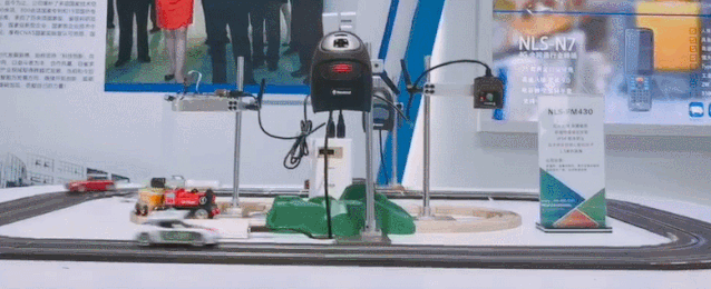 而现场摆放的赛车演示盘模拟了现代高速运转的流水厂线,搭载各类医用试管、电子器件、快递箱等条码的小火车则代表了实际应用场景的码制需求。当贴有各类条码的小车从形态各异的扫描器下方行驶而过时,设备立即准确捕获并解析条码图像,随后发出“嘀嘀”的成功识读反馈。